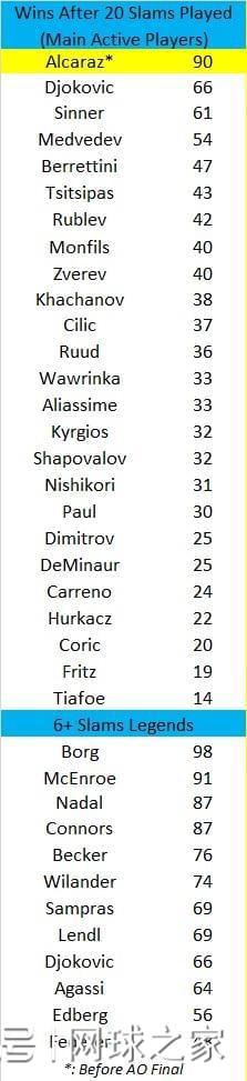 最让人惊讶的是,阿卡仅仅用了20站大满贯赛就实现了这个目标。放眼历史,生涯前20站大满贯胜场榜中,阿卡位列现役第一,历史上则暂时仅次于两位上古大神麦肯罗(91)和博格(98)。且看具体排行: